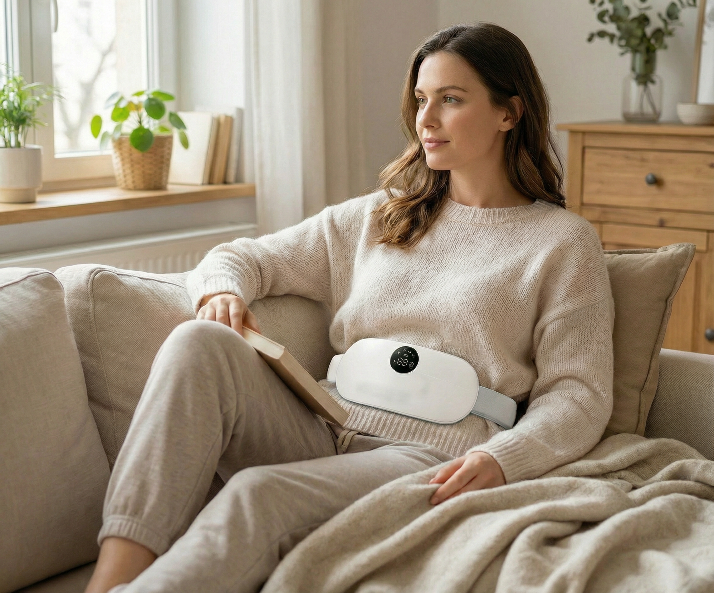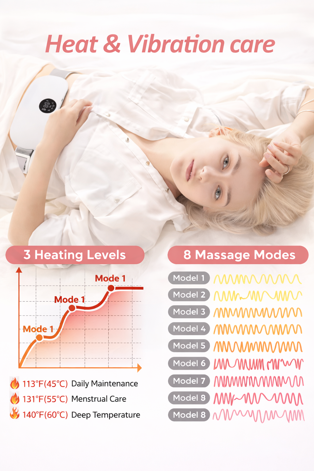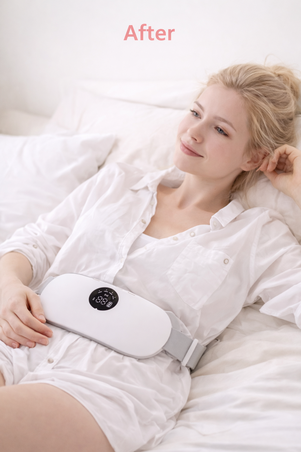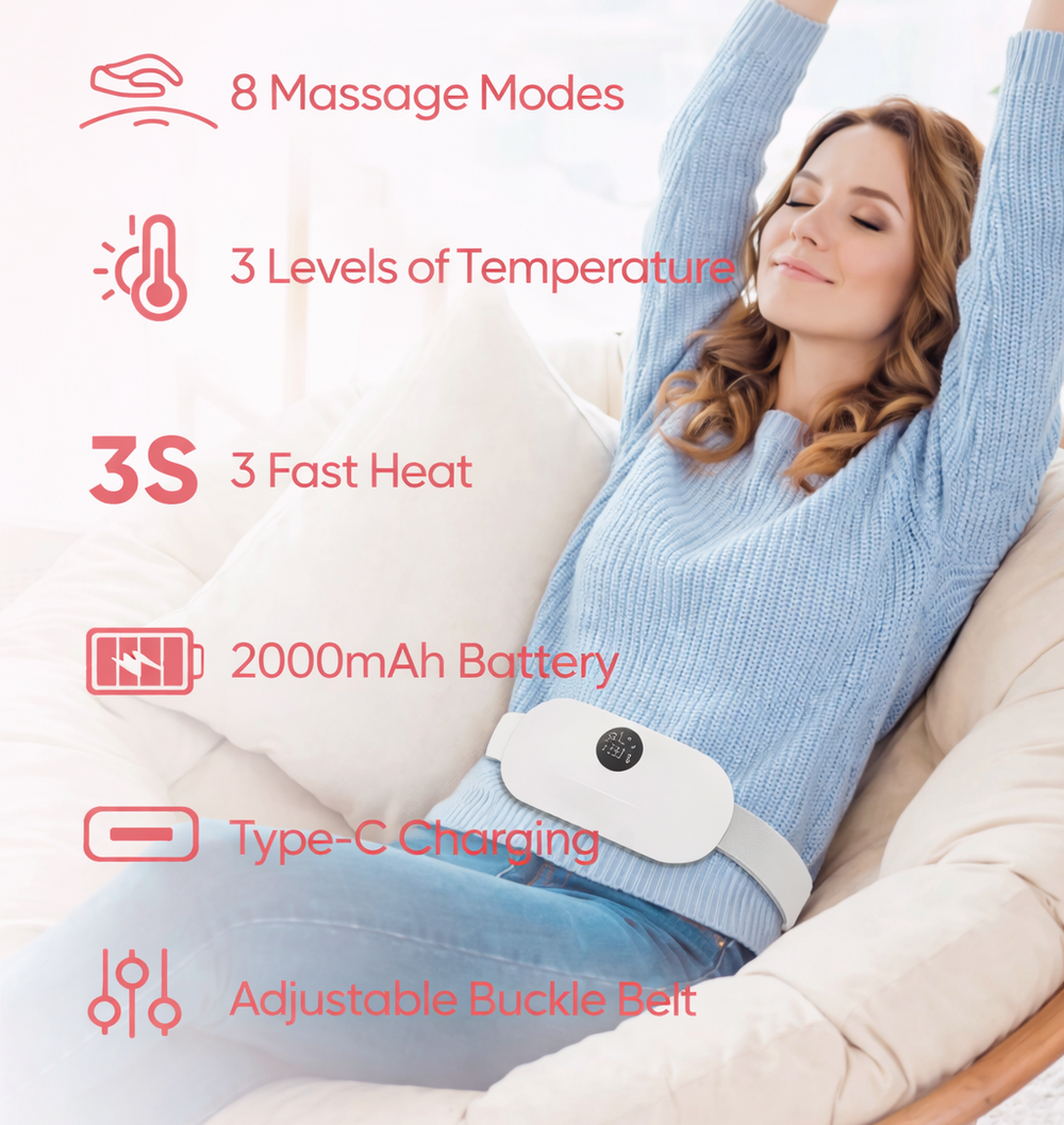 The belt provides soothing heat and gentle vibration designed to help relax the lower abdomen and ease discomfort during cramps, pelvic pain, and flare-ups.